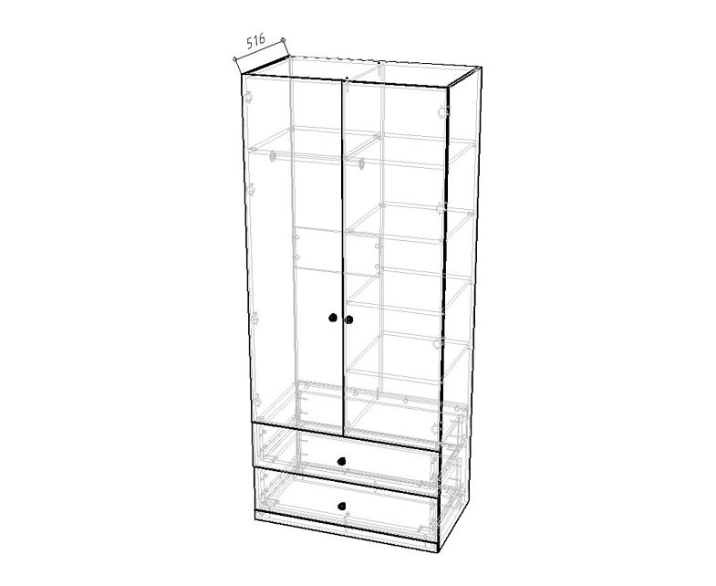 Комплектация: наполнение: П (полка под шляпы + штанга) / Б (4 полки) / 2 ящика, шариковые направляющие 100% выдвижения без доводчика, петли без доводчиков