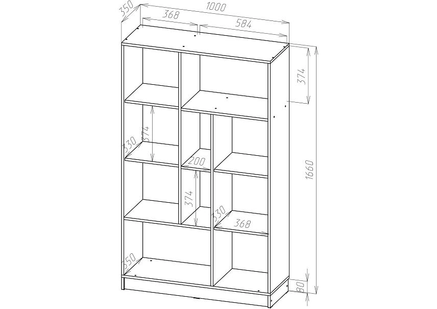 | Книжные шкафы, стеллажи от 600 мм до 1000 мм | 350 | 1000 | 600 |